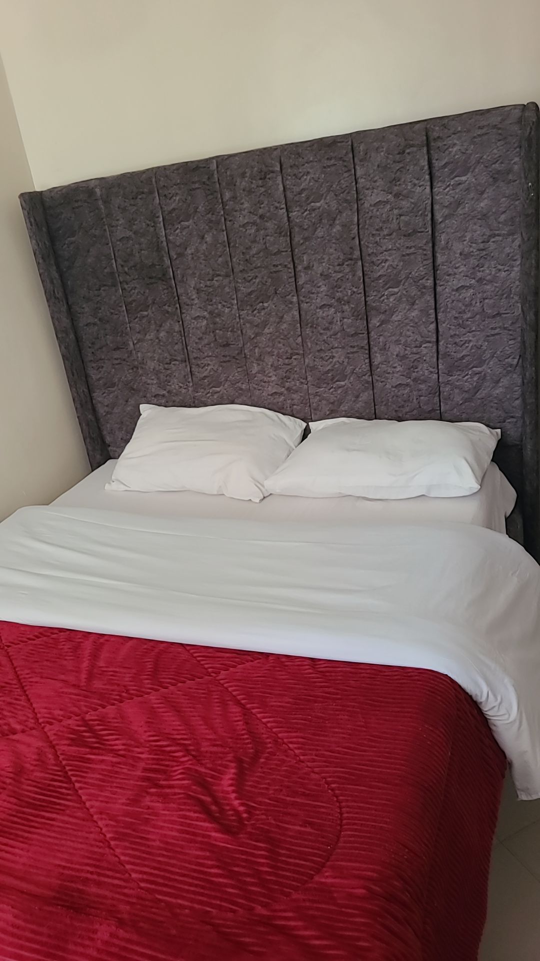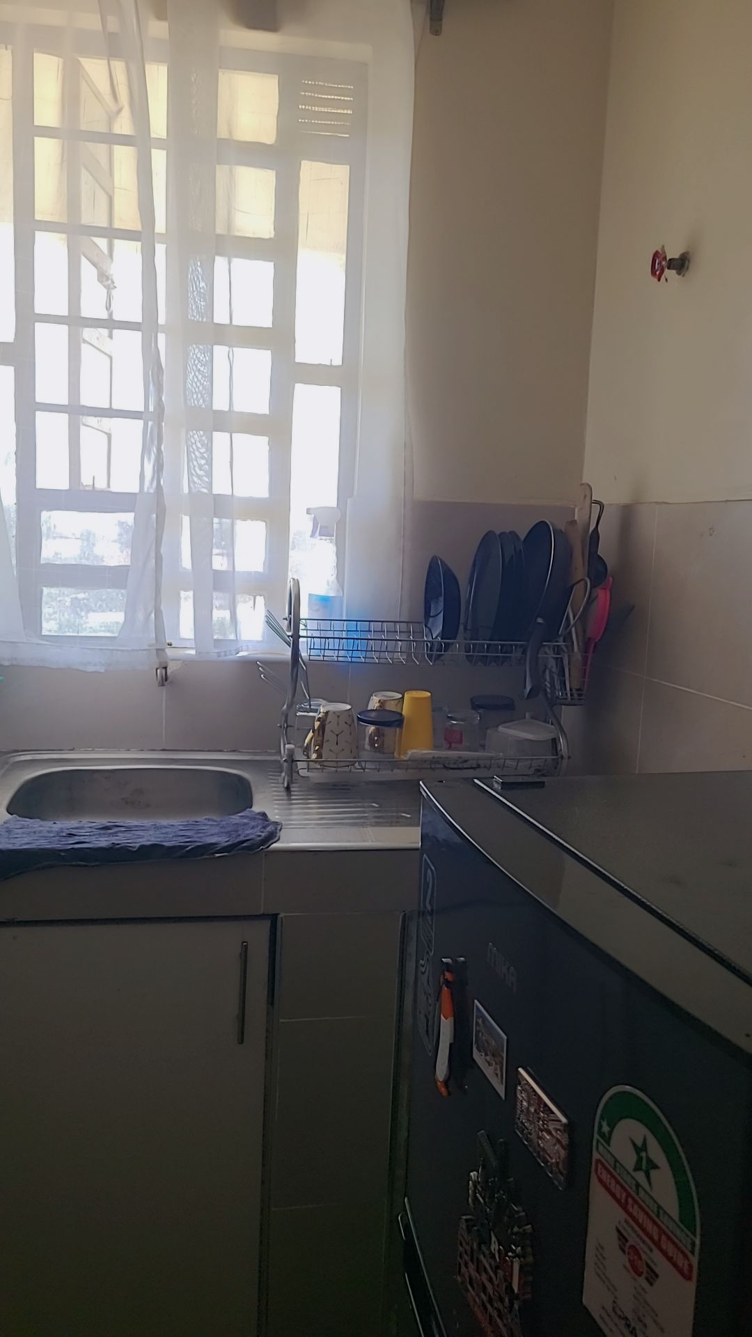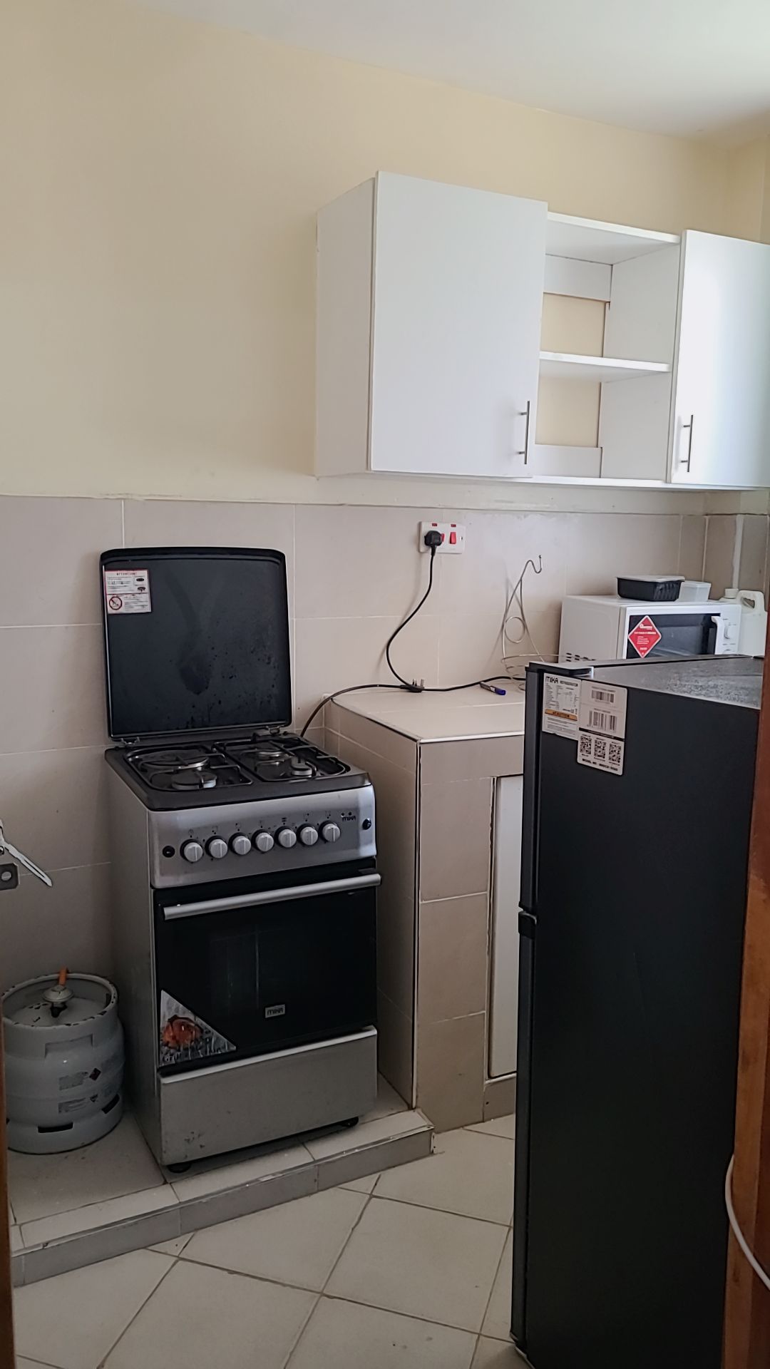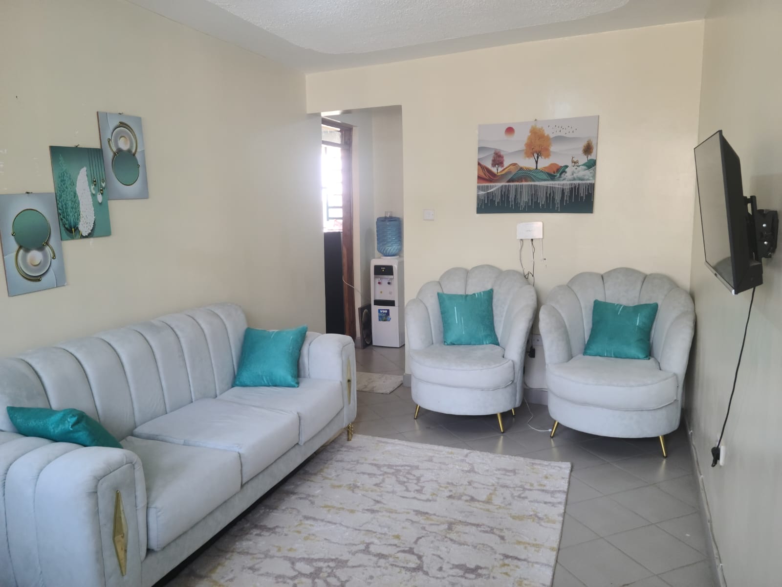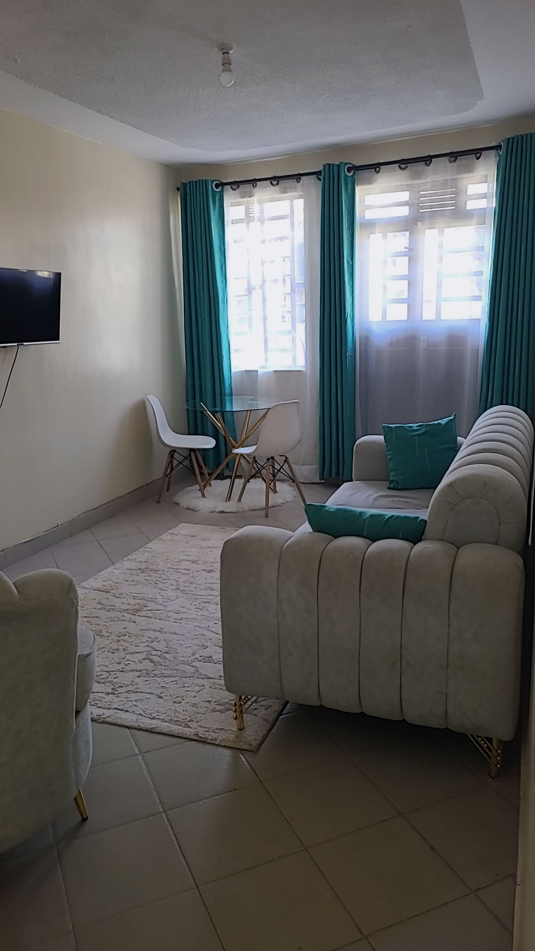 Experience comfort, privacy and convenience in this stylish fully furnished 1-bedroom apartment at H&H Suites, Utawala. The living room features plush sofas, wall-mounted TV, dining corner and blackout curtains. The kitchen is fully equipped with microwave, fridge, gas cooker + oven, cabinetry and dish rack for self-catering. Bedroom is fitted with a comfortable bed, hotel-grade bedding and large padded headboard. Bathroom is tiled with hot shower and proper ventilation.